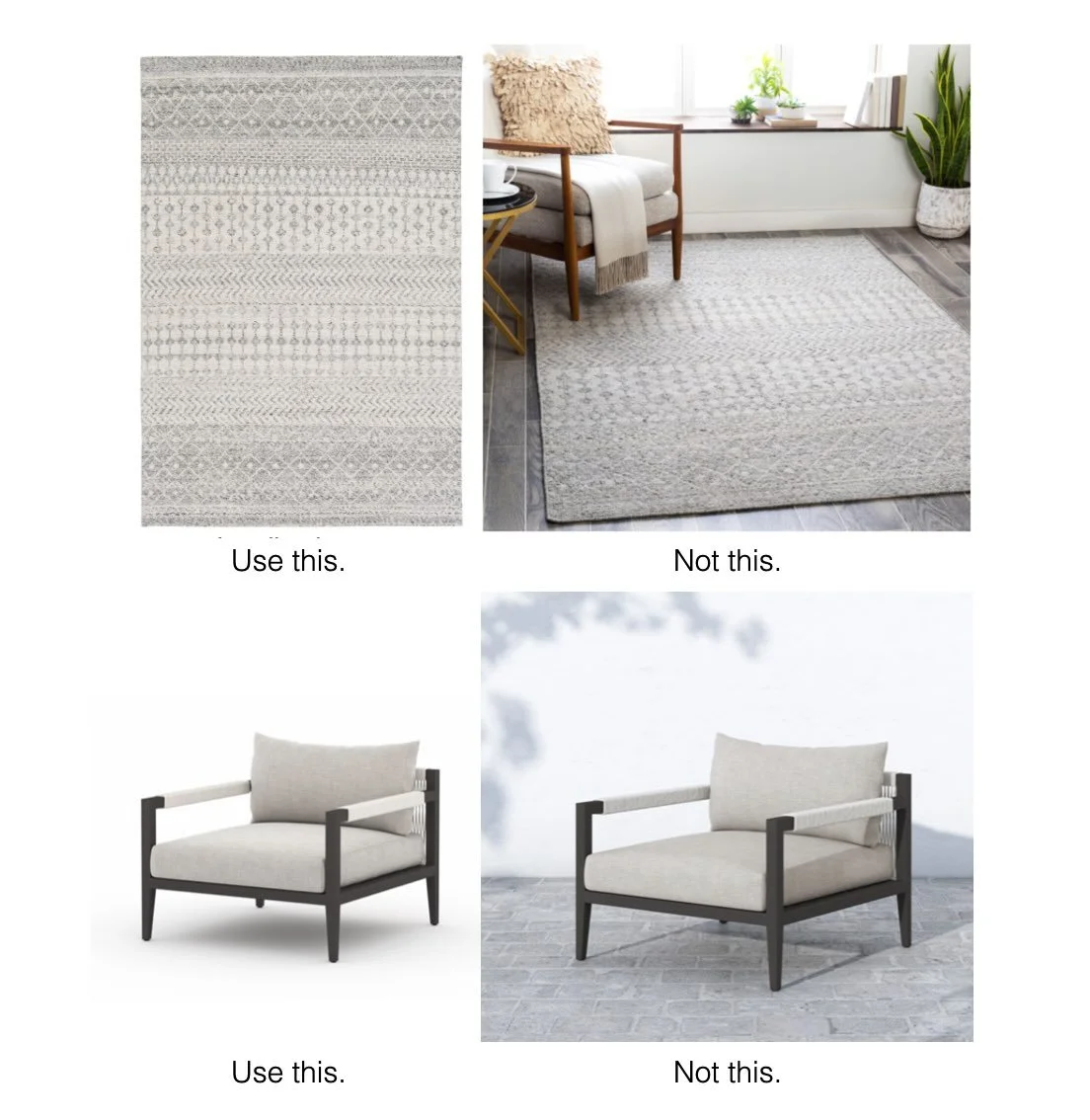 Take screen shots of possible products to fill your space. Try to find images of pieces in isolation, with solid, high contrast backgrounds, and oriented the way you would see it in your space. Rugs are tricky, but you can usually find images of them flat; use those, not the images shown in a space (unless it is handily shown in the right orientation for your space).