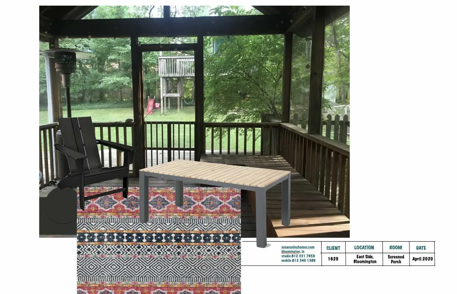 This is me trying some lighter options, but knowing Brian is going to nix them. I can’t imagine he’ll like the pricetag on that corner chair either. Here, I like the simplified palette, with a lot of the color coming from the green surroundings rather than the pieces inside the porch. Meanwhile all the open arms and backs are competing with the rails in the porch structure. Some of them have to go.