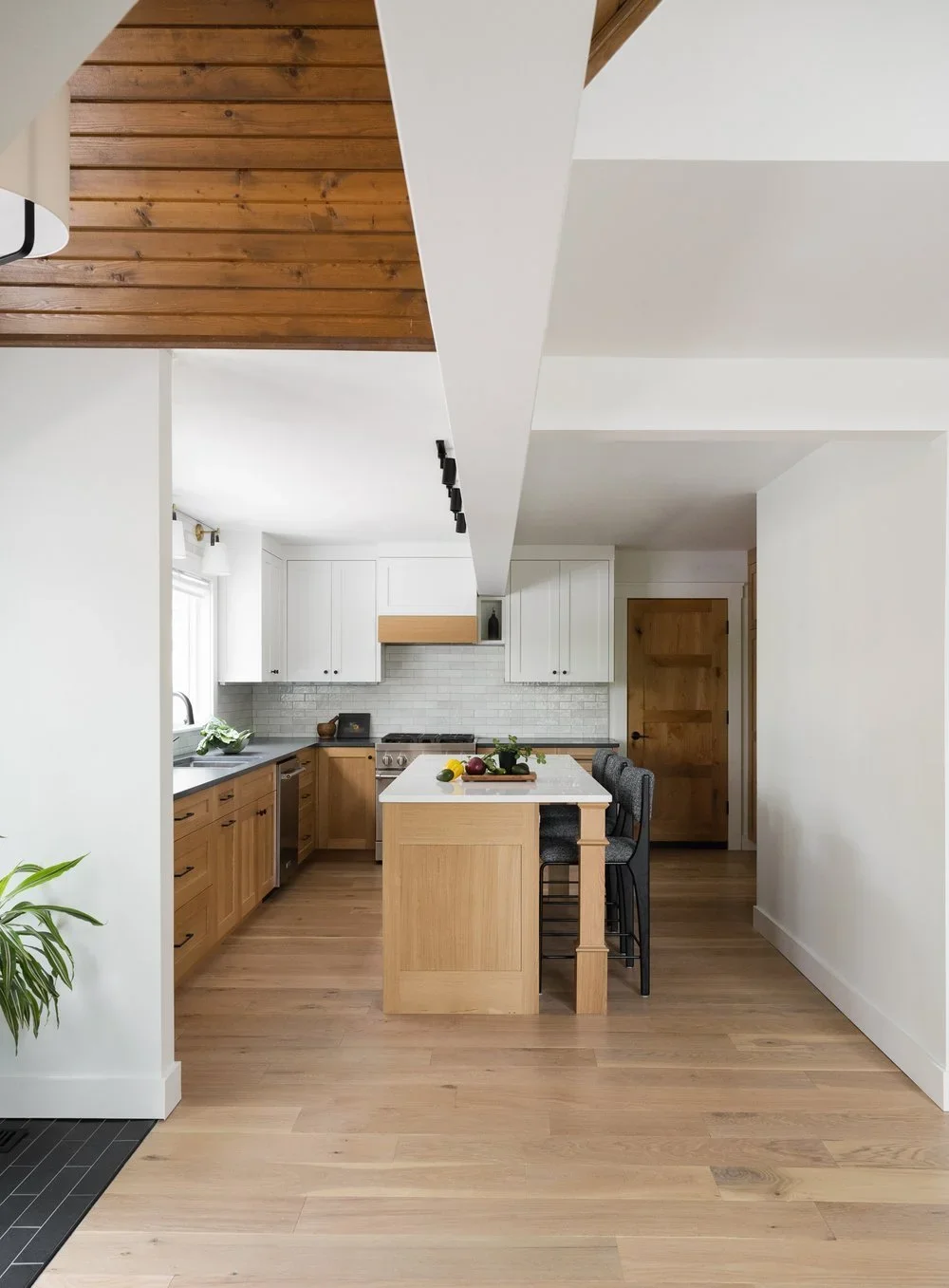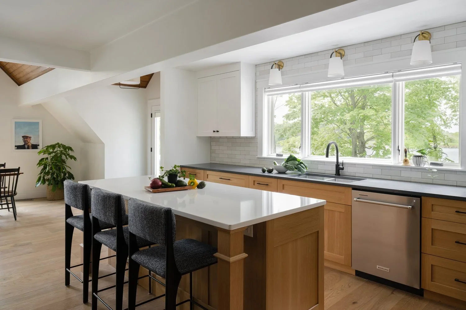 In our A-Frame Lake Retreat, we transformed a quirky weekend getaway into a serene but indestructible family hub. The formerly dark kitchen now captures lake views through a new, enlarged window, while a custom reading nook that doubles as extra sleeping space has become everyone's favorite spot for afternoon sun. White paint and neutral furnishings let the blues and greens outside take center stage, while practical materials handle everything from muddy paws to sandy towels.